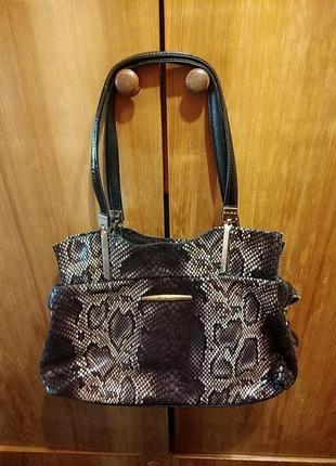 Сумка з натуральної лазерної шкіри під рептилію в поєднанні з лаковою шкірою, дуже містка, стан хороший, всі блискавки робітники. Є нюанси зсередини (зашита підкладка) і незначні тріщини на лакових деталі сумки. Зовнішній вигляд дуже гарний.