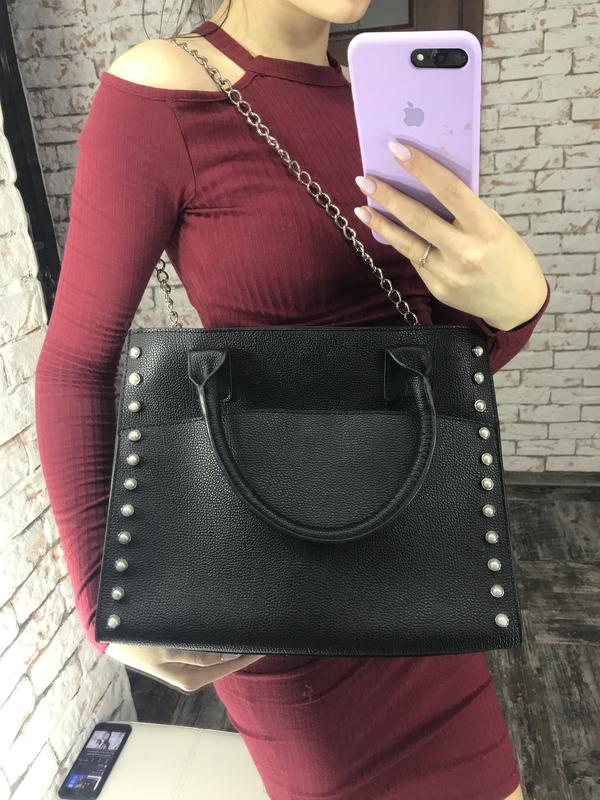 Сумка не є дуже велика але дуже вмістка Має одне віділення та між ними пересік з кишенею Також на переді кишеню річки короткі альо є ланцюжок довший Заміри .: Ширина 32см Довжина 26см