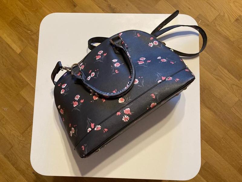 Дуже якісна, містка сумка, екошкіра, графітовий колір з милим малюнком на квіточку. Кілька відділень, два на блискавці. Є довгий ремінець.