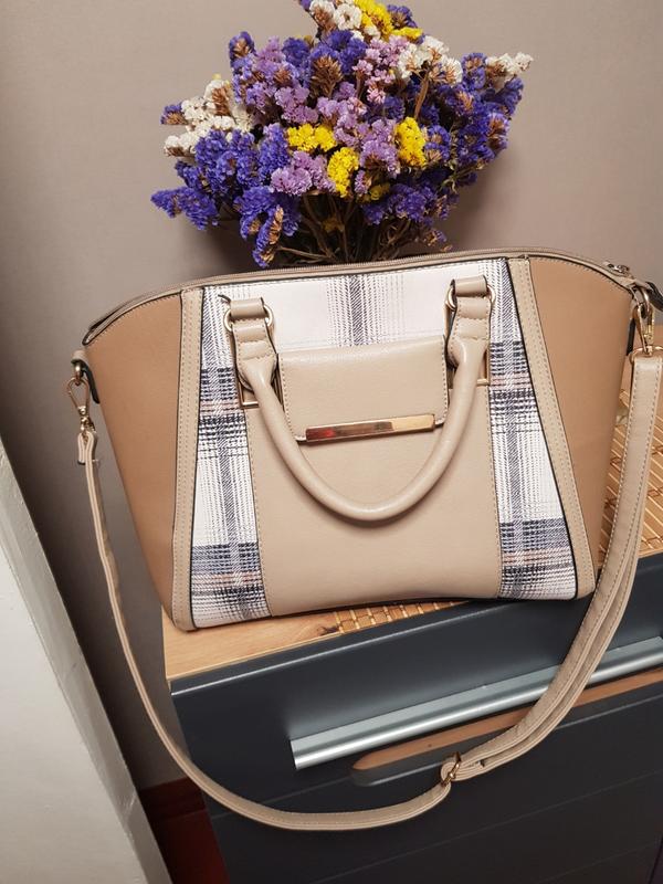 Довжина 41,висота 27,ширина 18.Одне місткі відділення і маленька кишенька. Майже непомітне плямочка на зворотному боці сумки