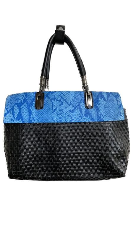Оригінальна жіноча сумка «Морська хвиля» із плетінням екошкіри чорного кольору в комбінації з екошкірою під рептилію блакитного кольору. Зовні є кишеня на блискавці. У сумці три відділення. У першому відділенні є дві кишеньки для телефону та ключів. У другому відділенні є кишеня на блискавці, третє відділення по центру як косметичка або потаємний карман. Сумка містка для необхідних речей. Заміри: висота: 27 см, ширина: 35 см, ширина збоку: 11 см.