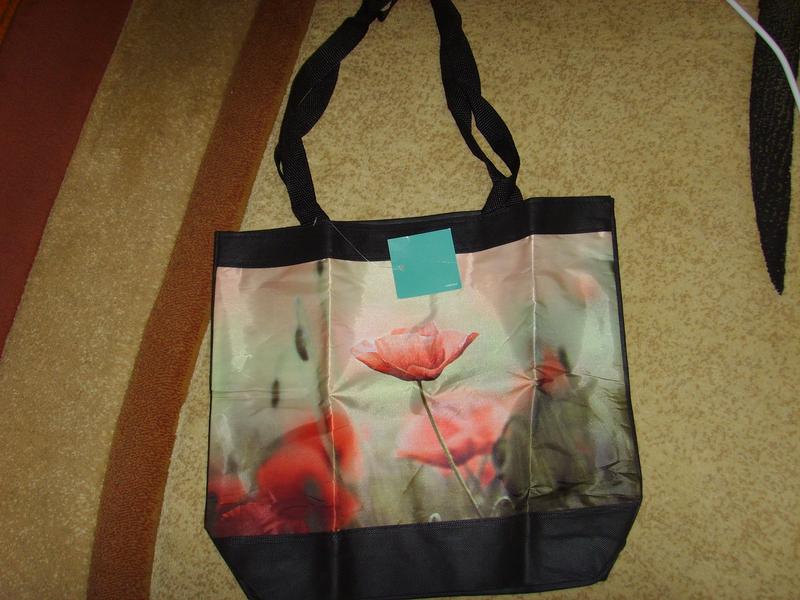 Сумка нова, без підкладки, тканина тонка, штучна якась, спереду нашитий красивий принт. Застібається на липучку, підкладки немає. Заміри - висота 34см.ширина від шва до шва 39див.ширина дна 8см. довжина ручок 64см.