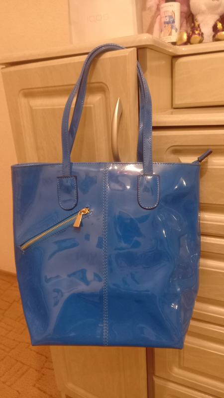 Синя лакова сумка,спереду і всередині кишеньки, висота 27см,ширина 30см, дно щільне 22×14см
