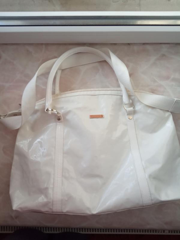 Большая белая текстильная лакированная сумка Versace Parfums в почти отличном состоянии. По бокам застегивается на кнопки. Внутри есть карман на молнии. Есть пятнышка на подкладке, слегка загрязненная длинная ручка, небольшое повреждение короткой ручки, пятно возле молнии (при носке не заметно). Сумка отлично моется. Длинная съемная ручка. Размеры: дно-45х14 см высота сумки-30 см ширина верха-45 см низа-54 см длина ручек-51 см, длина крупной ручки-88 см.