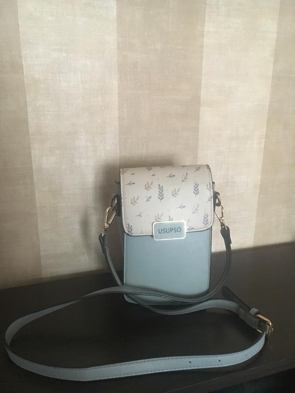 Стан новий. Є три відділення . Вона хоч і маленька але дуже містка . Колір сіро-блакитний. Вся фурнітура ціла і не облізла { одним словом нова}. Ширина 12,5 см, висота 20 см, ручка регулюється .