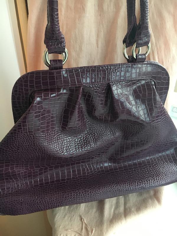 Нова сумка у формі редикюля Сток! Еко - шкіра , імітація під крокодила. Незвичайний колір "баклажан". Підійде як дорожній варіант. Всього 1 велика кишеня Ручки 41 см Ширина 46 см Висота 33 см