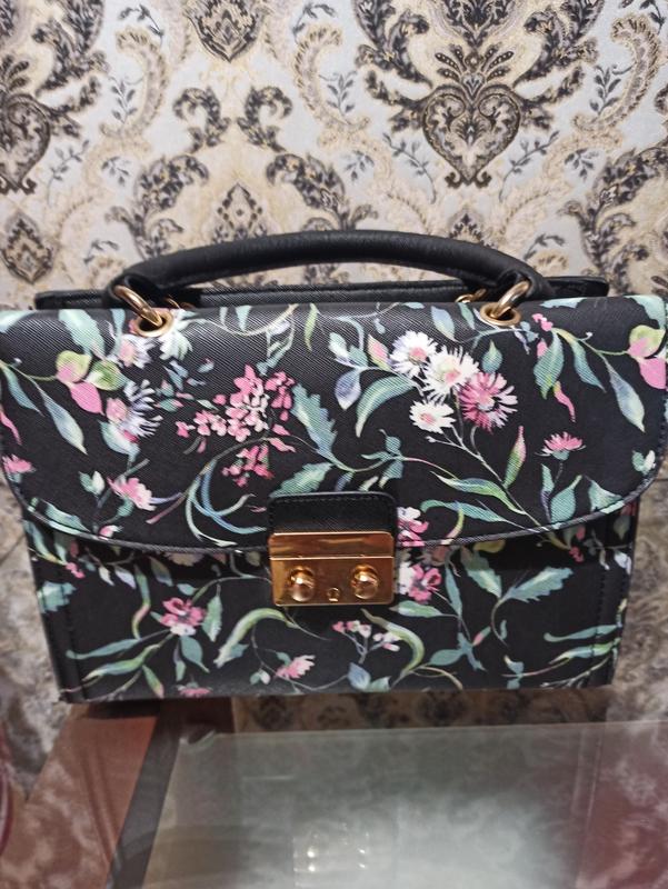Сумка в квітковий принт. Одне відділення, є кишенька на блискавці і один попереду закривається на замок. Є довга ручка. Стан хороший, але присутній запах хімобробки😟