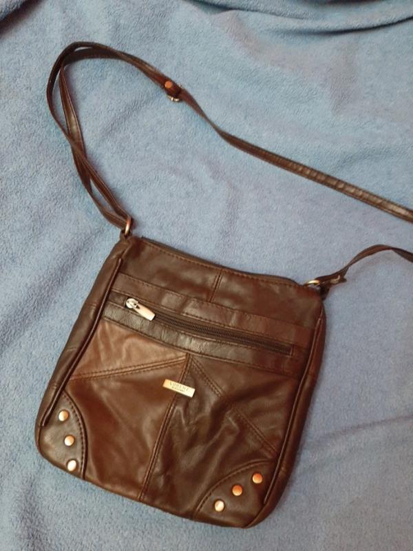 сумка з довгим ремінцем натуральна шкіра коричнева розм22 ×24 з трьома кишеньками на блискавці стан на фото