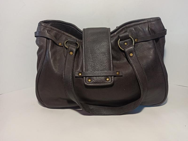 Хороша шкіряна сумка. Індія. Закривається тільки на клапан, без блискавки. Ст. 23 см, ш. 36см, р. по дну 14см. Шкіра товста, але м'яка.