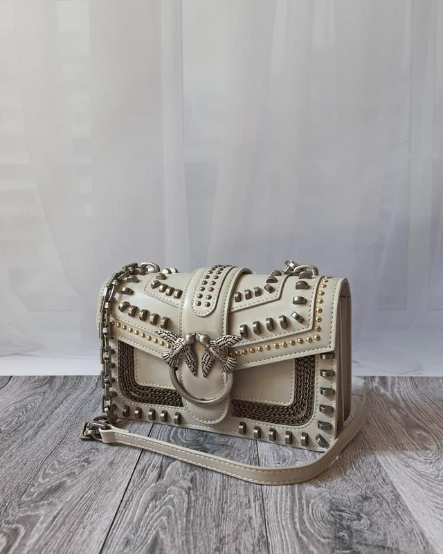 Pinko Mix Studs Код товара: 1819 MS - L Производитель: Китай Материал: Натуральная кожа Размеры: 21×7×12 Цвет: Бежевый Комплект: Фирменный пыльник, фирменная коробка