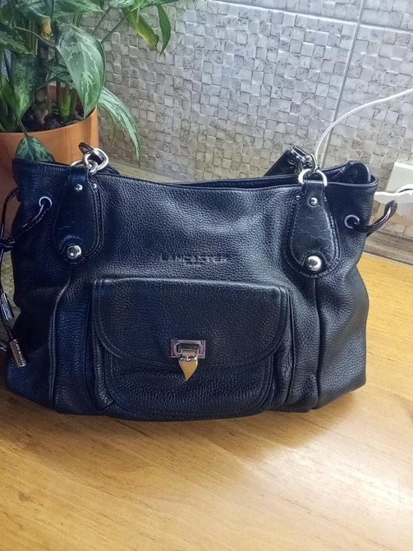 сумка чорного кольору, підклад вишневого. всередині одне велике відділення. від однієї стінки дві маленькі кишеньки для ключів та телефоном, з іншого боці дві кишені розміром на всю стінку - один з блискавкою, другий без. зовні одна кишеня на застібці-сердечку, з іншого боку на застібці-блискавці. вся фурнітура брендовані, підклад теж. сумка шкіряна, ручки лаковані. на одній ручці лакове покриття пошкоджене - видно на фото . розміри 36см*26см, дно 32см*14см. довжина ручки від кріплення до кріплення 48 см