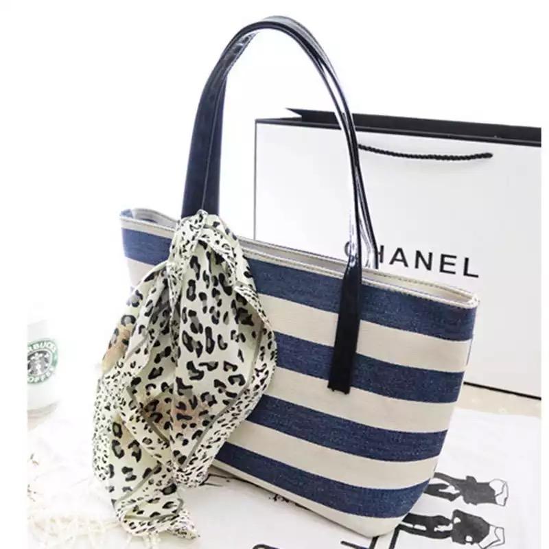 Плотная ткань, ручки кожзам. Стильная, вместительная летняя сумка. Синяя и чёрная полоска