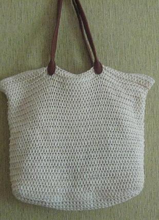 Сумка молочного цвета сверху имеет оригинальное пленение внутри подкладка ширина 45 см высота 39 см ручки коричневые