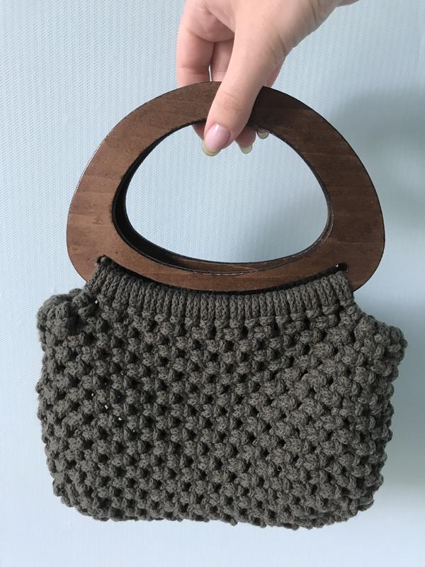 Сумка сплетена нитками макраме болотного кольору. Дерев'яні ручки покриті лаком.
