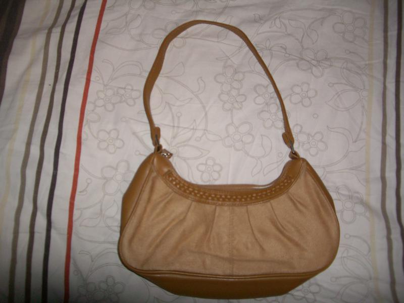 сумочка небольшого размера кофейного цвета, комбинирована из кожзама и искусственной замши, верхняя часть украшена косичкой с обоих сторон, замшевая часть в складки, одно отделение, внутренний кармашек застегивается на змейку, сумка застегивается на молнию, на коротком ремешке