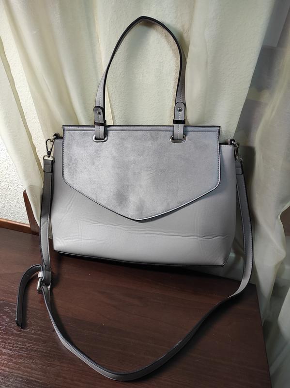 Сумка з комбінованого матеріалу. Модель з одним великим відділенням і клапаном на магнітній кнопці. Всередині — врізний кишеню. Виріб з короткою ручкою і знімним плечовим ремінцем. Ширина 37, висота 23, дно 13.