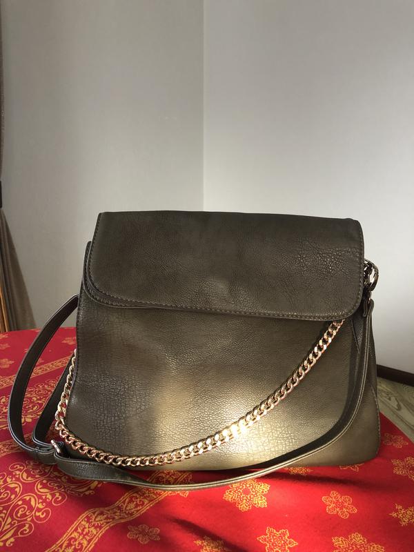 Стильна сумочка.Тримає форму.Ланцюжок може бути в ролі короткої ручки,або просто стильною прикрасою..Розміри -висота 25 см,ширина 14 см,довжина 35 див Довжина ланцюжка 66 див. Довгий ремінь регулюється