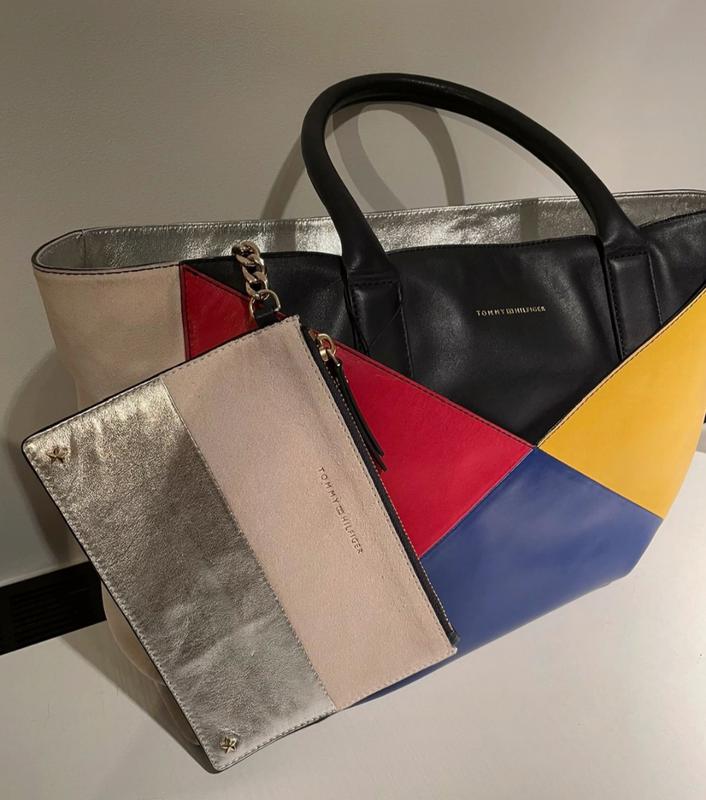 Сумка Tommy Hilfiger из кожи и замши с цветными блоками, со специальной серебристой подкладкой внутри и замшей по бокам. Съемный внутренний карман из замши и серебра с золотой цепочкой. Внутренний карман на молнии для хранения ценных вещей и передний карман на магните. Он также закрывается сверху на магниты. Идеально сочетается со всеми типами цветов. подходит для ноутбука, чтобы пойти на работу. новая но без этикетки. замеры на фото.