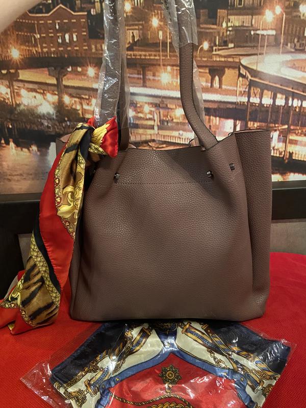 чудова сумка з якісної пресованої шкіри , коричнева благородного кольору , виріб виконано дивовижно , витриманий стиль завжди в моді. У сумці є ще одна Сумка , вона відстібається , додатково йде до них довгий ремінь 120 см . Зручний варіант для прогулянок , для походу в кіно , кафе , на будь-яке свято , ресторан і ін . Розміри великої сумки : Висота виробу 30см Довжина виробу 35 см Глибина виробу 12 см . Розміри малої сумки: Висота : 25 см Довжина 23см Глибина 7 см . Всередині малої сумки є один карман на змійці . У сумки якісна фурнітура , яка не облазить , не темніє. У сумці йде в подарунок хустку . Дивіться інші мої речі і сумки в профілі . Завжди домовимося про ціну .