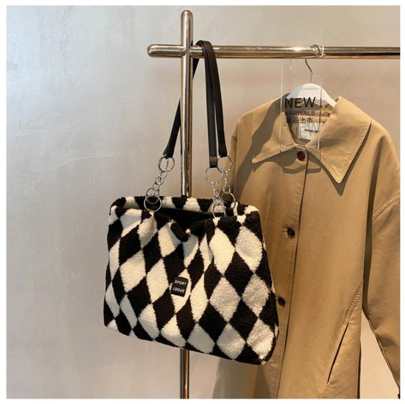 Женская сумка шоппер ромбик исскуственный мех черно-белый