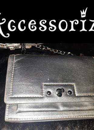 Срібляста маленька сумочка Accessorize ,стан нової,через плече.кожзам. Довжина 17 см, Висота 12 см Висота ремінця через плече 60 см,шир.1 см,(регульована довжина) Всередині 3 відділення. 1, кишеню 14×8 см 2 , 16×10 см на блискавці 3, 16×11 див.