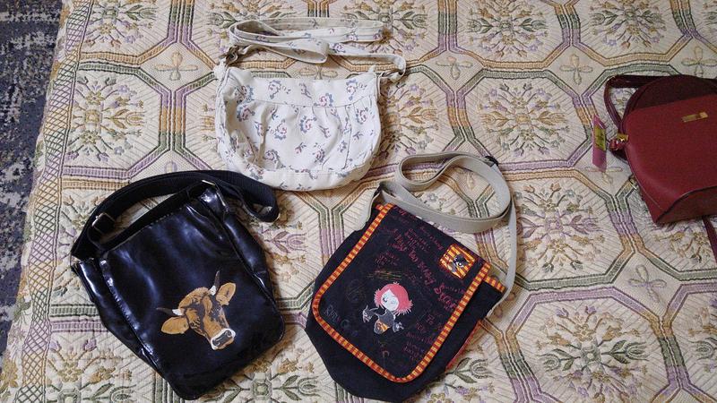 Продам сумочки через плече. Чорна з биком з лакової шкіри, на липучці. Чорна з дівчинкою з плащовки, на липучці. Бежева на замочку.