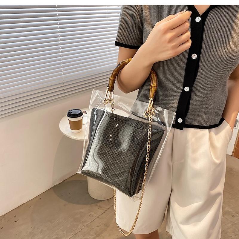 Прозрачная сумка с вынимающимися конвертом. Ручки сделаны под бамбук. Есть короткая и длинная ручка. Размер: 27,5/22 см