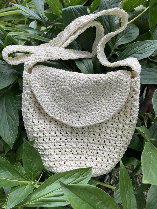 В'язана сумочка через плече з поліефірного шнура. Розмір: висота 18 см, ширина 20 см, довжина ручки 100 см. Дуже містка за рахунок круглого денця. Пришита якісна магнітна кнопка (Туреччина).