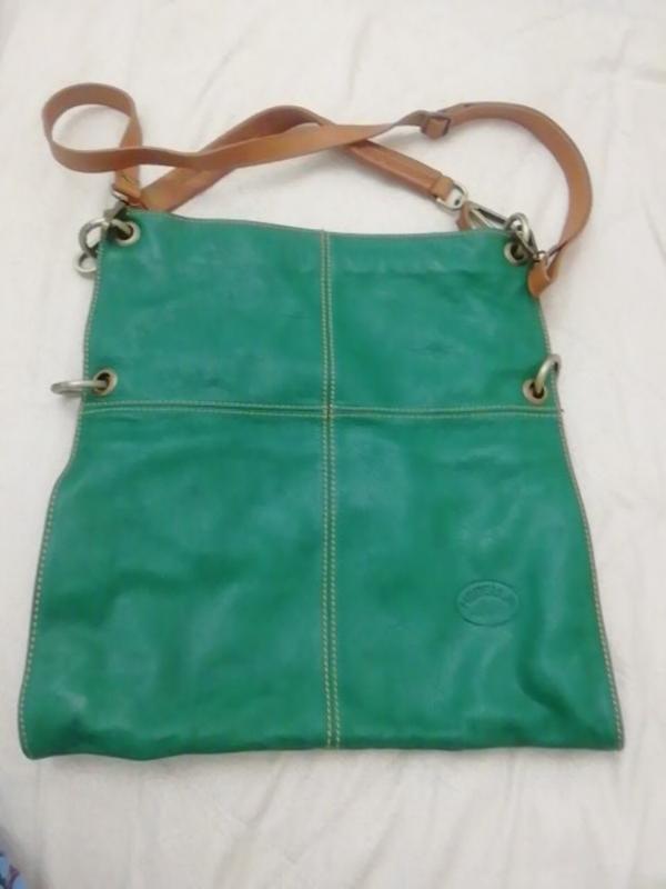 Шикарна,велика, італійська сумка з натуральної шкіри. Зелена і руда шкіра, м'яка і товста, дуже красиво виглядає. Сумка велика, але передбачено змінювати розмір в 2 рази менше, є кільця, переносите ручки і ремені і сумка менше.(4 фото). Дорога фурнітура. Рідкісна річ. Всередині з отд. середнє на блискавці, кишені. Висота 39, ширина 36,ширина 12 див.