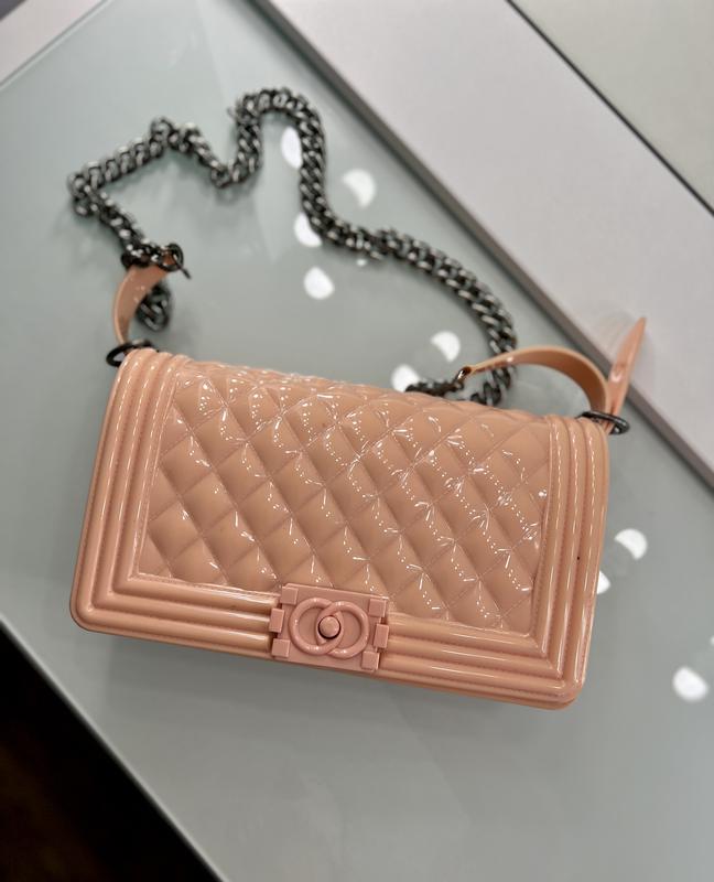 Сумка цукеркового відтінку в стилі відомого бренду з міцного силікону, важка ланцюг, усередині одне відділення. Розміри 25*15*8 З нюансів - трохи потерта пимпочка на замку.