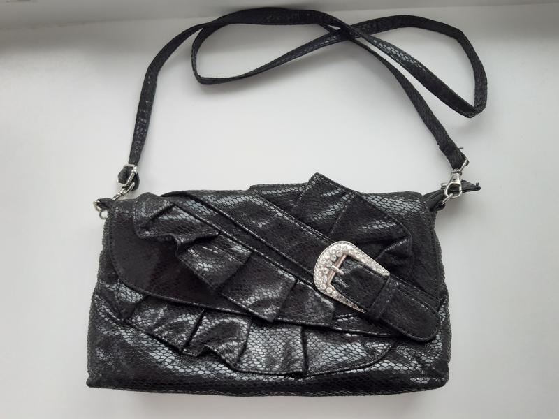 Сумочка з м'якого шкірозамінника під лазерну шкіру * пряжка прикрашена камінчиками* переливаються як бриллиантики. Усередині відділення з бічних кишеньок. Відділення закривається вгорі на блискавку плюс сумка закривається на магнітну кнопку.Дуже надійно. Ручку можна знімати. Розміри: 26Х 16Х 5 см. Довжина ручки з карабінами - 119 див. Стан ідеальний. Нюанс - загублений один камінчик. Це місце закрито ременем пряжки. Післяплати немає
