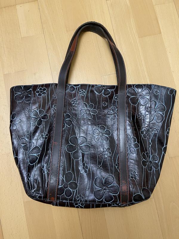 Сумка - шопер коричневого кольору з блакитним тисненням. Внизу 28 см, вгорі 45 см, висота 30 см, дно. 7 див. Нова. Дефект - місцями полущилася фарба ( на ручках).