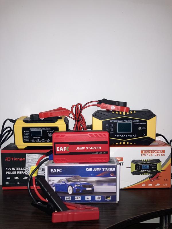 Зарядное устройство для аккумулятора (АКБ 12v / 12a - 24v / 6) Характеристики Зарядки для АКБ: Размеры: 150х100х62 мм Напряжение: 12 В-12 А, 24 В – 6 А Постоянное напряжение: 12 В, 12 А Режим десульфурации: импульсный Мощность: 180 Вт Поддержка аккумуляторов: 12 В, 24 В, 40 Ач-100 Ач Оригинал, 9 ступенчатый заряд ! 5 режимов заряда! Характеристики: Технология сенсорного переключателя: Да Защита от переполюсовки: Да Выходная короткая Защита: да Защита без подключения аккумулятора: Да Защита от перегрева: Да Защита от короткого замыкания: Да Защита от перегрузки по току: Да Защита от перегрева: Да Защита от низкого напряжения: Да Защита от перенапряжения: Да Защита от электрического удара током: Да Охлаждение: Вентилятор Портативный многофункциональный автомобильный стартер на 800А для аварийных ситуаций, мобильный источник питания и зарядка батареи 12В для старта автомобиля объемом до 3 л бензин и 2 л дизель. Цена: Зарядка:(TEISQI HIGH POWER ):12V 12A-24V 6A-1500грн. Зарядка :(RJ Tianye) : 8А, 12в - 800грн. Автомобильный стартер пусковик:(EAFC):800A 12v-100грн