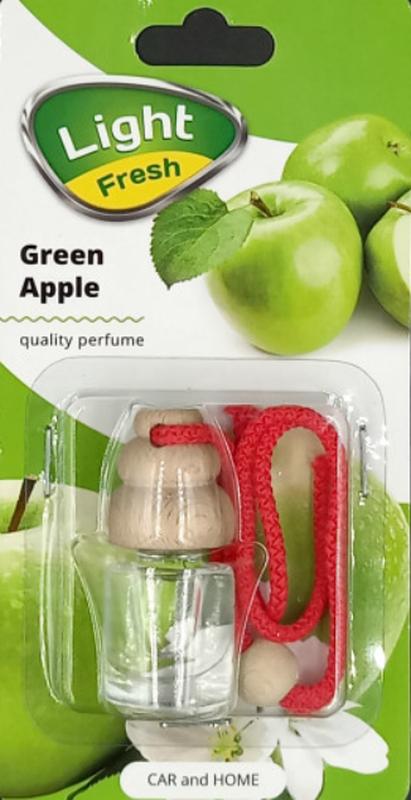 Ароматизатор — освіжувач повітря "Лайт Фреш" Зелене яблуко. Підходить як для салону автомобіля так і для інших приміщень. Ароматизатори виготовлені з якісних німецьких олій. Ці парфуми мають стійкий аромат, не викликають подразнення. Спосіб застосування: Відкрийте кришку та видаліть корок. Добре закрутити кришку та переверніть пляшечку догори дном, поки вона не просочиться. Підвісити парфуми в необхідному місці. Склад: парфумерна композиція. Увага: уникати зіткнення рідини з очима та обличчям. Берегти від дітей. У разі потрапляння в очі необхідно негайно промити великою кількістю води та звернутися до лікаря за медичною допомогою. Зіткнення з прямим сонячним світлом і пластмасовими поверхнями небезпечне.