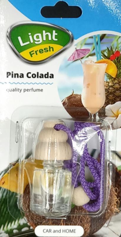 Ароматизатор — освіжувач повітря "Лайт Фреш" Піно Колада. Підходить як для салону автомобіля так і для інших приміщень. Ароматизатори виготовлені з якісних німецьких олій. Ці парфуми мають стійкий аромат, не викликає подразнення. Спосіб застосування: Відкрийте кришку та видаліть корок. Добре закрутити кришку та переверніть пляшечку догори дном, поки вона не просочиться. Підвісити парфуми в необхідному місці. Склад: парфумерна композиція. Увага: уникати зіткнення рідини з очима та обличчям. Берегти від дітей. У разі потрапляння в очі необхідно негайно промити великою кількістю води та звернутися до лікаря за медичною допомогою. Зіткнення з прямим сонячним світлом і пластмасовими поверхнями небезпечне.