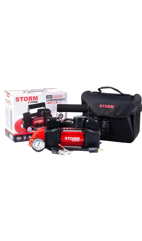 Компресор автомобільний 12 в, компресор для підтримки тиску в шинах (85 л/хв 10 Атм), NST Автомобільний компресор STORM підійде для закачування шин легкових автомобілів із напругою електромережі 12 вольтів. Пристрій здатний видавати максимальний тиск 10 атмосфер, цього досить для побутових цілей. Споживана потужність компресора становить 360 ватів. Висока якість виготовлення Корпус компресора виготовлений із комбінації металу та пластику. Зверху є зручна ручка для перенесення. На ніжках є спеціальні гумові демпфери, що гасять вібрацію в процесі роботи апарата. Окремо хочеться зазначити невеликі розміри та невелику вагу компресора, що разом із високою продуктивністю й надійністю робить цю модель дуже зручною і практичною в експлуатації. Кабель для під'єднання до мережі автомобіля має довжину 3 метри, цього досить для комфортного використання. Час безперервної роботи становить 15 хвилин. Характеристики: - Продуктивність за 0 барів: 85 л/хв - Напруга: 12 В - Максимальний тиск: 10 Атм - Максимальний споживаний струм: 30 А - Експлуатаційна температура: -40 до +80 °C - Довжина шнура живлення: 3 м - Довжина шланга подавання повітря: 5.7 м Додаткові характеристики: - 2-циліндровий із затискачами АКБ - Потужність: 150 Вт - Продуктивність: 85 л/хв - Для радіуса: 17 R - Швидкість завантаження: 2 Атм у 2 хв Комплектація - Обладнаний високоточним манометром - Надійна сумка з високоякісного матеріалу для зберігання - Затискачі для АКБ із запобіжником - Комплект змінних насадок із запасним запобіжником Розміри: 140 х 210 х 260 мм Вага: 2.25 кг