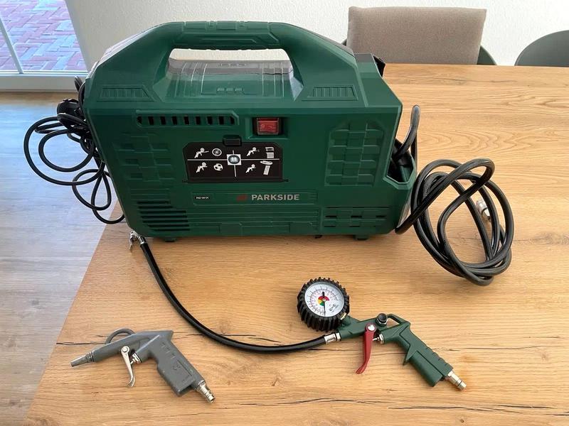Компресор повітряний для шин, компресор повітряний для фарбування авто (180 л/хв 8бар) Parkside, NST - безліч можливостей застосування під час роботи зі стисненим повітрям, наприклад, наповнення та продування - ефективний електродвигун дає змогу легко та швидко підвищити тиск - необслуговувана робота без використання олії - міцний корпус із ручкою та ніжками - перемикач увімкнення/вимкнення зі світловим індикатором - спіральний шланг для стисненого повітря з роз'ємом - вбудований відсік для аксесуарів - без бака Комплект містить: - 1 пістолет із манометром - 1 шланг зі швидкодійним важелем - набір із 9 фітингів та насадок для всіх можливих застосувань. Технічні характеристики: - потужність двигуна: 1100 Вт - робочий тиск: максимум 8 барів - оберти: 3550 хв-1 - потужність всмоктування: приблизно 180 л/хв - Матеріал: пластик, метал Розміри: - компресор: 46,4 х 34,7 х 13,8 см - Пістолет тиску з манометром: приблизно 24 х 7,65 см. - довжина мережевого кабелю: приблизно 5 м - довжина кабелю стисненого повітря: приблизно 3 м Попередження: - Не підходить для пневматичних інструментів — використовуйте тільки з навісними пристосуваннями. Будь ласка, дотримуйтеся інструкцій з безпеки, зазначених в інструкції з експлуатації.