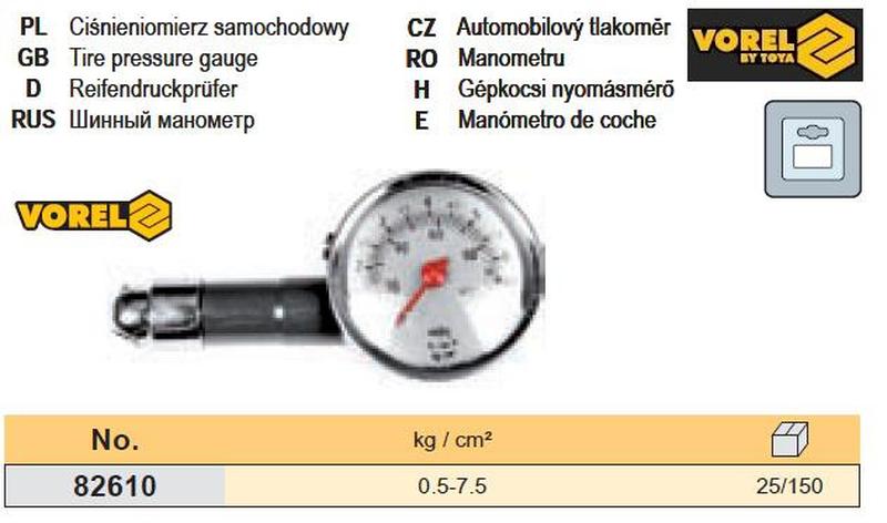Манометр шин круглий 0,5-7,5 бар vorel-82610