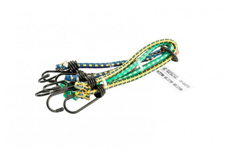 Резинки багажні Mastertool - призначені для фіксації вантажів під час транспортування. Використовуються в автомобілях, велосипедах, скутерах, мотоциклах, сумках-візках, тачках тощо. Довжина 450 мм. Діаметр 8 мм. Кількість гаків 8 од