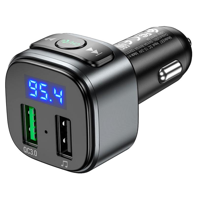 Модулятор в машину через телефон, Фм трансмиттер на андроид, Блютуз передатчик звука Hoco, NST автомобильное зарядное устройство c FM-передатчиком, позволяющее отвечать на вызовы и воспроизводить музыку с вашего телефона или USB-накопителя на аудиосистеме автомобиля. Особенности: - 2 USB порта для зарядки телефона - Поддержка функции Handsfree - Принцип работы: мобильный телефон подключается к трансмиттеру через BT, трансмиттер подключается к автомобильному динамику через FM - Вы можете подключить свой телефон через Bluetooth к данному устройству и воспроизводить музыку с помощью мобильного телефона на автомобильную стереосистему. - Вы также можете использовать это устройство для управления громкостью музыки, переключения треков - Поддерживает быструю зарядку QC3.0 - Возможность подключить USB Flash - Отображение параметров на дисплее Технические характеристики: - Версия Bluetooth: V5.0 - Вход: DC12V-24V - Выход: USB1 - 18W (для QC / FCP / AFC) USB2 - 5V / 1.5A - Размер: 74 х 37 х 36мм - Вес: 31г