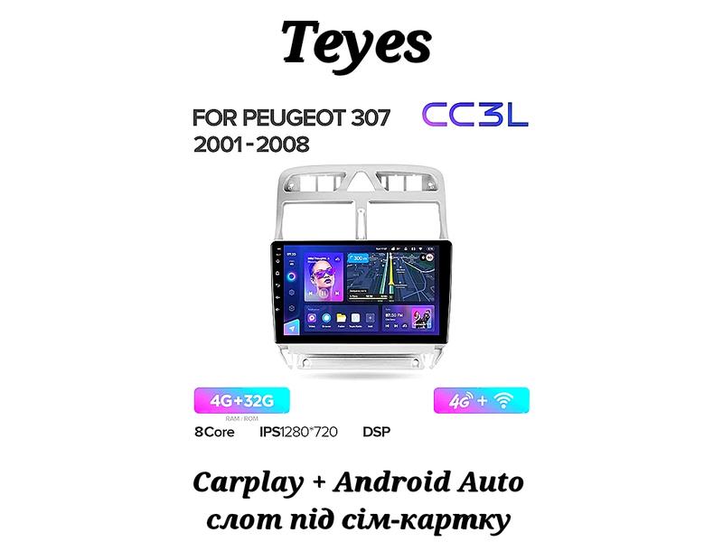 Магнітола teyes cc3l peugeot 307, 4/32, 8 ядер, carplay, слот під сім-картку + рамка!