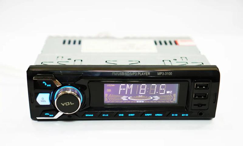 Опис Автомагнітола MP3-3100 - в машину розміром 1 DIN з Bluetooth, FM тюнером, з підтримкою відтворення з USB-накопичувачів та карт пам'яті SD, є AUX. Магнітола має виходи на 4 динаміки, 2 USB порти, максимальна вихідна потужність - 50 Вт. У комплекті є пульт дистанційного керування. Магнітола MP3-3100 має незнімну передню панель чорного кольору з лаковим покриттям та синім підсвічуванням кнопок. На лицьовій панелі автомагнітоли розташовані рідкокристалічний дисплей, кнопки керування, зручний регулятор гучності, AUX-вхід, 2 роз'єми USB та роз'єм для SD карт пам'яті. До магнітолі можна підключити USB-флешку або карту SD, можна через AUX підключити портативний плеєр, телефон або планшет. Також можна програвати музику через Bluetooth (профіль A2DP), вбудований Bluetooth можна використовувати для телефонних дзвінків гучним зв'язком та передачі потокового аудіо. На задній панелі розташовані ISO роз'єми - 1 для підключення живлення та керування магнітолою, другий для підключення до магнітоли динаміків (штекери йдуть у комплекті). Також ззаду розташовані дві пари виходів RCA для підключення додаткового підсилювача звуку або сабвуфера. та вхід для FM- антени. Автомагнітола MP3-3100 відтворює файли MP3, WMA, є 5 пресетів еквалайзера, є ручне налаштування частот, на екрані відображаються назви треків. FM-тюнер автоматично здійснює пошук радіоканалів і здатний зберегти в пам'яті до 18 радіоканалів. Особливості: - Bluetooth-підключення для телефону; - USB для відтворення музики із носіїв; - FM-радіо з функцією RDS; - Годинник; - Зручне керування за допомогою кнопок на лицьовій панелі; - Підтримка форматів MP3, WMA; - Високоякісний звук; - Універсальний розмір 1 din для встановлення у більшість автомобілів. Функції: - Модель: МП3-3100. - Тип: Автомагнітола 1 DIN. - Потужність: 50 Вт. - Кількість каналів: 4. - Опір: 4-8 Ом. - Частота: 20-20 000 Гц. - Дисплей: Монохромний. - Підтримка карток пам'яті: USB 2.0, SD caed до 64 Гб. - Живлення: 12 V 5-10 A. - Радіо: FM 87.5-108 МГц. - Панель: Незнімно. - USB-порти: 2 USB 2.0. - Bluetooth: 4.0. - Відношення сигнал/шум: >60 dB. - Еквалайзер: 5 пресетів. - Підтримує формати MP3, WMA. - Матеріал: метал, пластик. - Колір: Чорний. - Розміри: 180 * 130 * 50 мм. - Вага: 300 г. Комплектація: - Автомагнітола MP3-3100; - 2 роз'єми ISO; - Пульт дистанційного керування; - Напівшахта; - Упаковка.