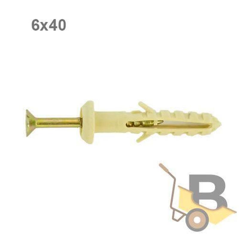 Дюбель 6х40 мм швидкого монтажу з ударним шурупом із грибоподібною головкою. Дюбель має запобіжник, що запобігає передчасному розпиранню при забиванні цвяха. Стопорний борт дюбеля запобігає його провалюванню в отвір. В упаковці 100 шт.