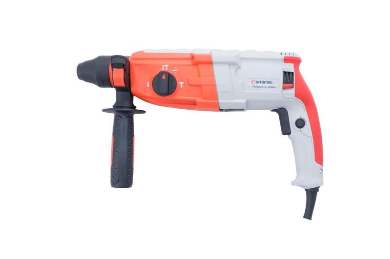 Перфоратор DT-0185 — це чудовий помічник дому під час ремонту, також виконує будь-які монтажні, оздоблювальні та будівельні роботи в побутових умовах. Ця модель перфоратора із системою кріплення бурів SDS-Plus і горизонтальним розташуванням двигуна має компактні габарити з ідеальним балансуванням у руці. Електродвигун потужністю 1000 Вт чудово працює з твердими матеріалами, як-от: бетон, цегла, камінь. Частота ударів — 5100 уд./хв, максимальна енергія — 3,5 Дж, легко справляється з цегляним муруванням, відколює штукатурку, штробіт стіни, стелю, підлогу та ін. Три режими роботи Свердління Свердління з ударом Удар (з можливістю встановлення положення зубила) В режимі свердління перфоратор розвиває 1300 об/хв і робить отвори в сталі — 13 мм, у бетоні — 28 мм, дереві — 40 мм. Швидкість роботи регулюється куркою на ручці. Також для зручності під час тривалих робіт передбачений фіксатор кнопки увімкнення. Крім перерахованих вище режимів роботи, у перфораторі передбачений реверс, який необхідний під час заклинювання оснастки, для її звільнення. Перфоратор обладнаний бічною ручкою, призначеною для зручного перехоплення інструмента в роботі. Ручка може бути встановлена під ліву або праву руку для комфортного використання. Прогумований надійний мережевий шнур зносостійкий, на вході в інструмент посилений і захищений від перегинів за допомогою обертального елемента. Довжина шнура (290 мм) дає змогу працювати без додаткових подовжувачів. Перфоратор і всі комплектуючі аксесуари запаковані в надійний кейс із додатковими ребрами жорсткості для більшої міцності. Металеві замки на кейсі вбережуть від випадкового розкриття й довго слугуватимуть, широка ручка на кейсі дасть змогу зручно переносити перфоратор і всю оснастку. Особливості: Продуктивний і компактний; Швидка зміна бурів із системою SDS-plus; Висока якість деталей і збирання; Захист від перевантажень у разі заклинювання; Реверс; Набір аксесуарів (бури, піки, зубило); Міцний кейс із металевими замками для зручного зберігання. Комплектація Перфоратор Бічна ручка Глибокомір Бури 6, 8, 10 мм Піка Зубило Інструкція Гарантійний талон Число обертів холостого ходу: 0-1300 об./хв; Споживана потужність: 1000 Вт; Частота удару: 0-5100 уд./хв; Кількість режимів: 3; Максимальний діаметр свердління: Максимальний діаметр свердління: сталь: 13 ммбетон: 28 ммдерево: 40 мм; Енергія удару: 3.5 Дж