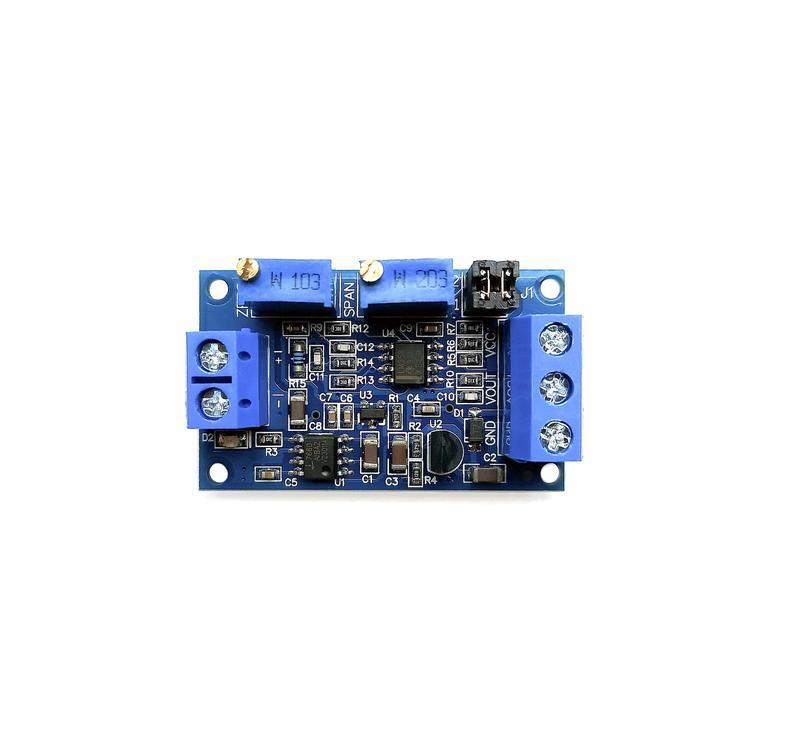 Модуль перетворювача струму в напругу 0/4-20 мА/0-10 В Може функціонувати як інтерфейс для підключення датчиків або перетворювачів. Вхідний сигнал 4-20mA/0-20mA перетвориться у вихідну напругу 0-3,3В/0-5VВ/0-10В відповідно. Характеристики(HW - 685) : • Назва бренду : TZT • Напруга живлення : 7-36В • Вихідна напруга: 0-3.3В/0-5В/0-10В • Робоча температура: - 40...+85 • Розміри: 4,2 x 2,5 см • Вес: 10 гр. Вибрати відповідний діапазон за допомогою перемичок: • 4-20 мА: 0-2,5В: J1 1,2 замкнутих, 3,4 замкнутих 0-3,3В: J1 1,2 розімкнених, 3,4 розімкнених 0-5,0В: J1 1,2 замкнутих, 3,4 замкнутих 0-10,0В: J1 1,2 замкнутих, 3,4 розімкнених • 0-20 мА: 0-3,3В: J1 1,2 замкнутих, 3,4 замкнутих 0-5,0В: J1 1,2 замкнутих, 3,4 замкнутих 0-10,0В: J1 1,2 замкнутих, 3,4 розімкнених Інструкція: 1) Напруга живлення 7-36 в(якщо вихід 10В, напруга живлення має бути більша 12В) 2) Після включення живлення горить світлодіод D2, плата із захистом зворотного підключення 3) При фактичному мінімальному значенні на вході Iвх=4 мА або Iвх=0 мА, встановити потенціометром "ZERO" мінімальна вихідна напруга Vout=0,0В 4) При фактичному максимальному значенні на вході Iвх=20 мА, встановити потенціометром "SPAN" максимальна вихідна напруга Vout=3,3В або 5В або 10В. У тих випадках, коли на вході 4-20мA, мінімальний вихід може бути 2,5В. • SMD: 7660 інвертор напруги LM358 - ОУ 3-32В LM317L - 1,2-37В/0,1А TL431 - опорна напруга T7