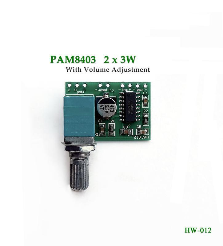 PAM8403 2 х 3W With Volume Adjustment Стереопідсилювач D-класу на мікросхемі PAM8403 2 х 3 Вт із регулятором гучності. Потенціометр має перемикач, який вимикає живлення. Характеристики XTW8403: • Напруга живлення: 2.5-5В • Вихідна потужність: 2 х 3 Вт за 4 Ом, 2 х 1.5 Вт за 8 Ом • Опір навантаження: 4-8Ом • Діапазон робочих температур: -40... +85°C • Розміри модуля: 27.9 х 19.9 х 15 мм • Вага: 8,85 гр.