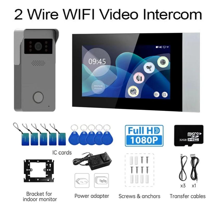 2 провідний відео домофон розумний дім Tuya wi-fi 1080 7 дюймовий сенсорний екран камера дверний дзвінок Комплектація: - Сенсорний 7 дюймовий екран 1080р - Карта пам'яті 128 ГБ - Панель виклику з камерою нічного бачення та датчиком руху; - Підтримка мов англійська, російська, іспанська, німецька, французька. - Можливість керування з телефону по wi-fi Tuya - В комплекті 5 шт магнітних карт, 5 штук магнітних ключів для доступу відкривання калітки; - Системний пароль 666666 - Блок живлення 15V 2A