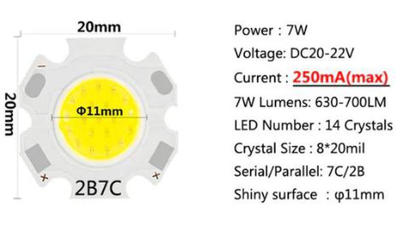 Виробник: Інший виробник Тип комплектуючих: Модулі Кілька примірників у наявності 7W Світлодіод COB нейтральний з підкладкою 630-700 lm Характеристики товару: Назва продукту: Світлодіод з підкладкою, підстава для лампи Потужність: 7 W Колір: нейтрал Колірна температура: 4100 K SMD Кількість кристалів: 14 шт. Яскравість лампи: 700 lm Кут освітлення: 120 градусів Вхідна напруга: 20-22 V Вхідний струм:250 ма Матеріал підстави: алюміній Розмір продукту: 20 мм підстава, 11 мм робоча поверхня