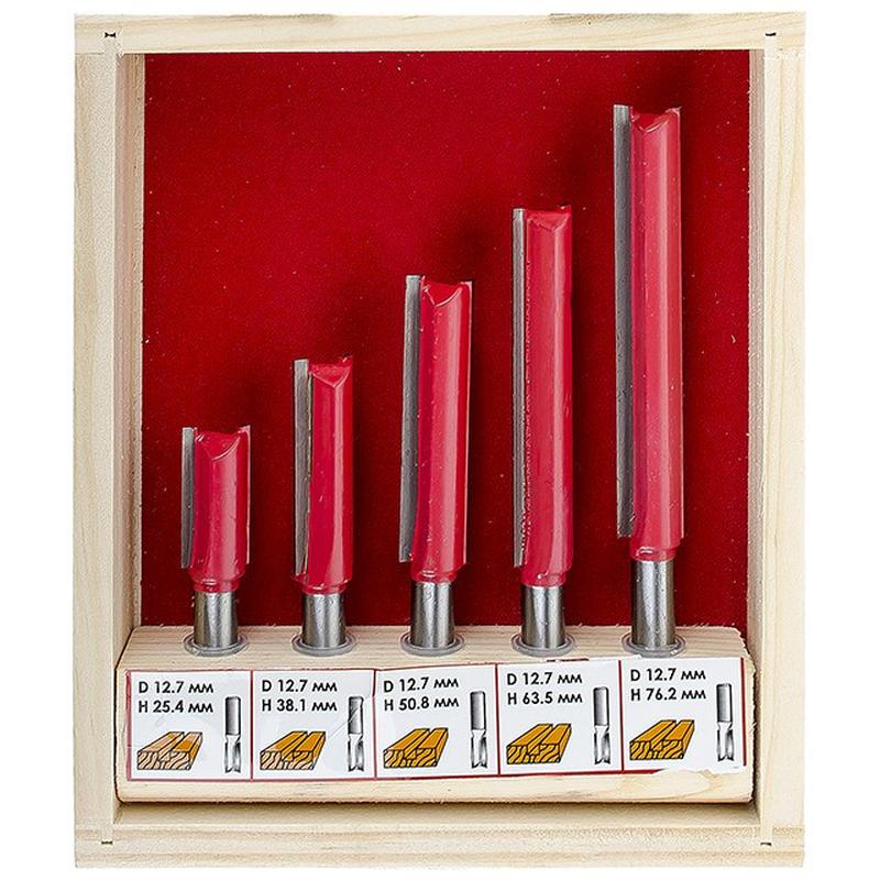 Фрези являють собою інструмент з одним або декількома ріжучими лезами. Фрези призначені для фрезерування, вибірки пазів різної форми, виконання шпоночного паза і ін. Фрезерування – це процес механічної обробки матеріалу фрезою, що обертається навколо своєї осі з великою швидкістю і має або напаяні (механічно встановлені), або виконані з цільного матеріалу ножі. У наборі HT-0075 представлені 5 фрез різної довжини. Це прямі пазові фрези, які призначені для виготовлення прямих пазів різної ширини і глибини, а також для наскрізного отвору. Прямі пазові фрези як у наборі HT-0075 використовуються для прорізання шпонкових отворів для дверей або вікон. Також, ці фрези використовуються для подвійного шпунтового з'єднання, шпильок потайного або полупотайного з'єднання та ін Все фрези укомплектовані спеціальний дерев'яний кейс, який зручний як для зберігання, так і для транспортування. При роботі з прямими пазовою фрезами не рекомендується встановлювати велику глибину обробки для першого проходу по виробу, від 7 і більше міліметрів. Якщо вам необхідно виконати глибокий паз, його потрібно проходити в кілька етапів, щоб уникнути навантаження на двигун фрезера і поперечної навантаження на фрезу. Якщо вам необхідно виконати широкий паз, теж не потрібно поспішати з цим. Бажано пройтися попередньо фрезами від меншого до більшого, щоб уникнути навантаження. Твердість наших фрез за шкалою Роквелла оцінюється в 89 HRC. Це забезпечує високу міцність інструменту і збільшує термін служби. Розміри фрез, представлені в наборі HT-0075: ТЕХНІЧНІ ХАРАКТЕРИСТИКИ І ДОКУМЕНТАЦІЯ HT-0075 Твердість за шкалою Роквелла 89 HRC Кількість в наборі 5 од. Діаметр фрези 12.7 мм Діаметр хвостовика 8 мм Довжина робочої частини 25.4; 38.1; 50.8; 63.5; 76.2 мм Вага 0,372 кг
