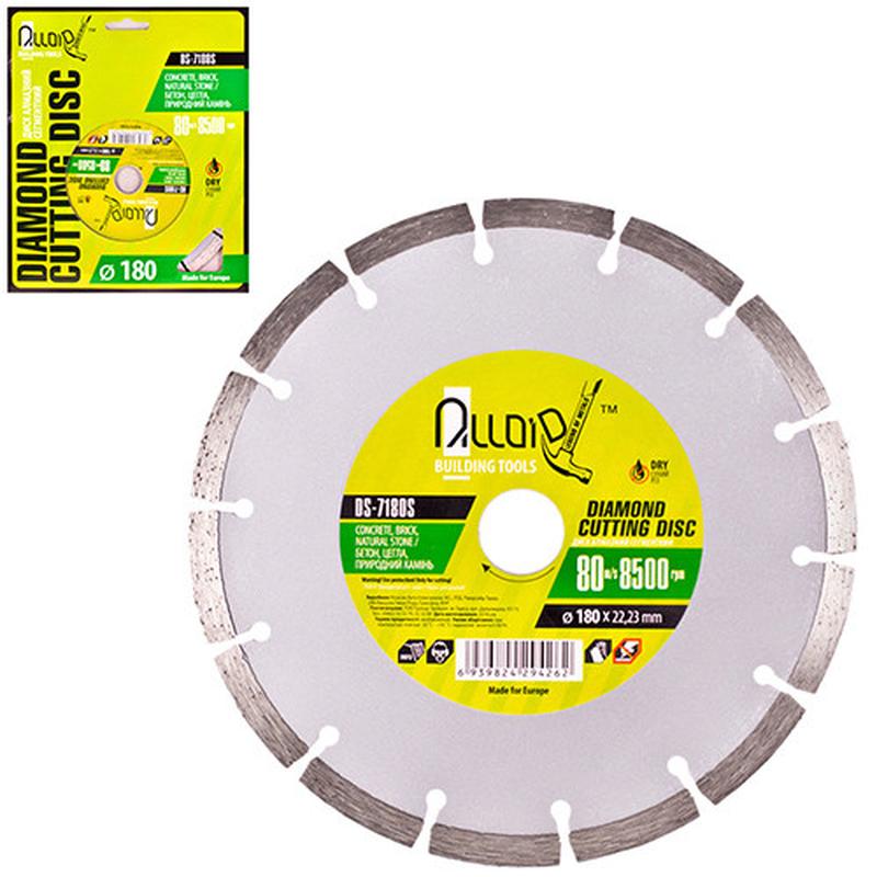 Алмазний відрізний сегментний диск Alloid Опис: Алмазний відрізний диск Alloid призначений для сухого різання будівельних матеріалів, таких як бетон, цегла, камінь та плитка. Завдяки сегментній конструкції забезпечується ефективне охолодження та зниження тертя, що збільшує термін служби диска. Переваги: - Висока якість різу – спеціальні алмазні сегменти гарантують точний і чистий різ. - Тривалий термін експлуатації – витримує високі навантаження без швидкого зношування. - Ефективне охолодження – сегментна конструкція сприяє швидкому відведенню тепла. - Широка сумісність – підходить для більшості кутових шліфувальних машин. - Багатофункціональність – відмінно справляється з бетоном, цеглою, природним і штучним каменем. Диск Alloid DS-7180S з сегментами, діаметром 180 мм і посадковим отвором 22,23 мм. Диск має високі технічні характеристики і призначений для щоденного професійного використання у сфері будівництва та ремонтних робіт. Диск Alloid DS-7180S з сегментами від Alloid є високопрофесійним інструментом. Диск виготовлений з високоякісного сплаву, що гарантує йому надзвичайну міцність та довговічність. ПЕРЕВАГИ АЛМАЗНОГО ДИСКУ Alloid DS-7180S: Висока міцність: ріжучий шар приварений до металевої основи диска методом вварювання алмазного шару, виключає порушення цілісності диска при тривалій і інтенсивній роботі. Цим самим забезпечується надзвичайна якість та довговічність роботи диска. Самоохолодження: вирізи, що розділяють диск на сегменти, мають спеціальну клиноподібну форму для найкращого охолодження диска і, тим самим, збільшують безперервний час роботи диска в рази. Ідеальне балансування: за рахунок високоякісних матеріалів, досконалої форми та точно відцентрованої посадки на електроінструмент, диск має ідеальне балансування. Диск алмазний відрізний сегментний Alloid DS-7180S призначений для сухої різки таких матералів як бетон, цегла, тверді та м’які породи каменю, бруківка. Завдяки простоті та унверсальності використання алмазний відрізний диск Alloid DS-7180S підходить як для побутового, так і для професійного використання. ALLOID - ІНСТРУМЕНТ ДЛЯ УКРАЇНСЬКИХ МАЙСТРІВ Компанія Vitol має великий досвід роботи з професійним інструментом відомих брендів, тому добре розуміє потреби споживачів у різних сферах діяльності. Спираючись саме на потребу та запит наших клієнтів, більш ніж 10 років тому виникла ідея створення власної торгової марки інструменту, яку невдовзі було втілено в лінійці інструменту на ім’я Alloid. Першочерговою концепцією бренду Alloid було створення якісного й доступного продукту для побутового використання. Вийшовши на ринок, завдяки своїй якості та характеристикам інструмент Alloid одразу ж здобув популярність не тільки серед майстрів-аматорів, а також й серед професіоналів. Від наших клієнтів, що мали змогу оцінити якість Alloid, почали надходити запити на спеціалізований професійний інструмент та обладнання. Тоді, щоб задовільнити цю потребу, асортимент Alloid було доповнено лінійкою спецінструменту та обладнання для СТО. Наразі інструмент Alloid активно використовується майстрами на професійних СТО, у промисловості та виробництві, у будівництві та ремонті, а асортимент бренду налічує більш ніж 5000 найменувань універсального, автомобільного та будівельного інструменту. Ми гарантуємо якість інструменту Alloid, адже несемо повну відпо
